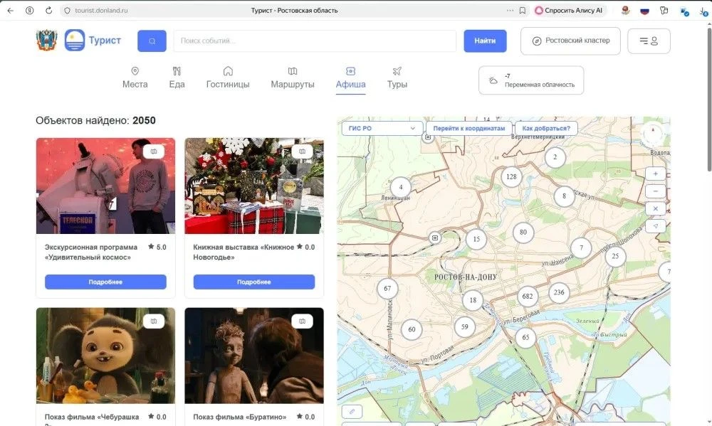Информационное содержание веб-портала «Турист» определяется, исходя из выбора пользователем туристического кластера или конкретного района Ростовской области. По умолчанию на веб-портале отображается информация о г.Ростове-на-Дону.